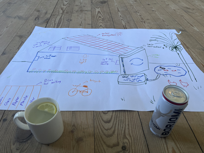On a light brown wooden floor in Bakuriani, Georgia, a large sheet of white paper displays a hand-drawn conceptual diagram