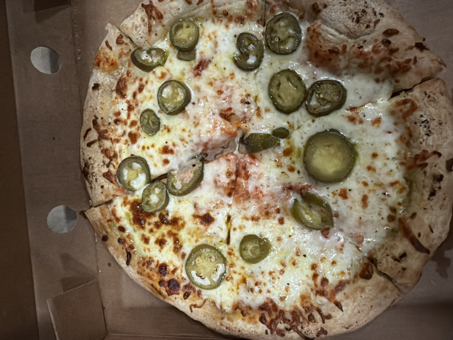 A top-down view reveals a pizza in a cardboard box. The pizza, cut into uneven slices, is topped with melted cheese, a hint of tomato sauce, and numerous slices of jalapeños. The crust is thick and appears to be slightly browned with some dark spots. The pizza fills most of the box, with some of the cardboard visible around the edges.
