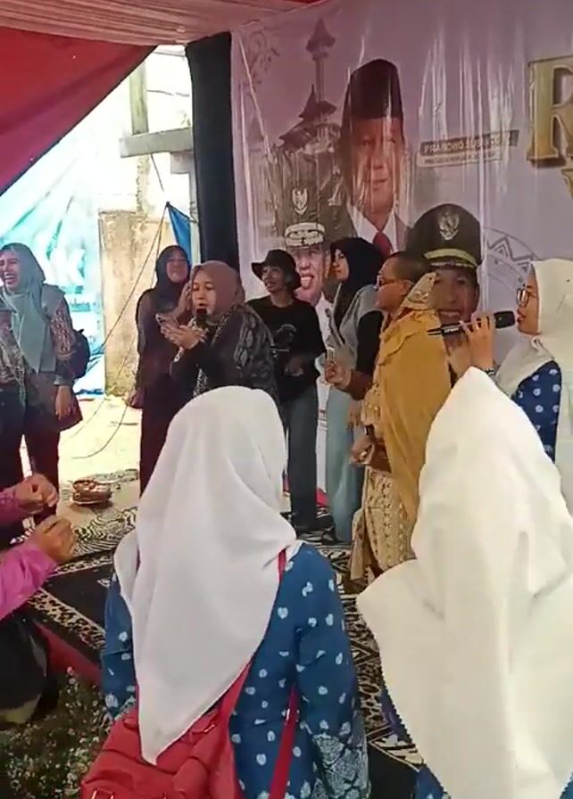 A group of women are gathered under a tent singing karaoke with a microphone, with a banner in the background featuring a portrait of Prabowo Subianto, an Indonesian politician and former general