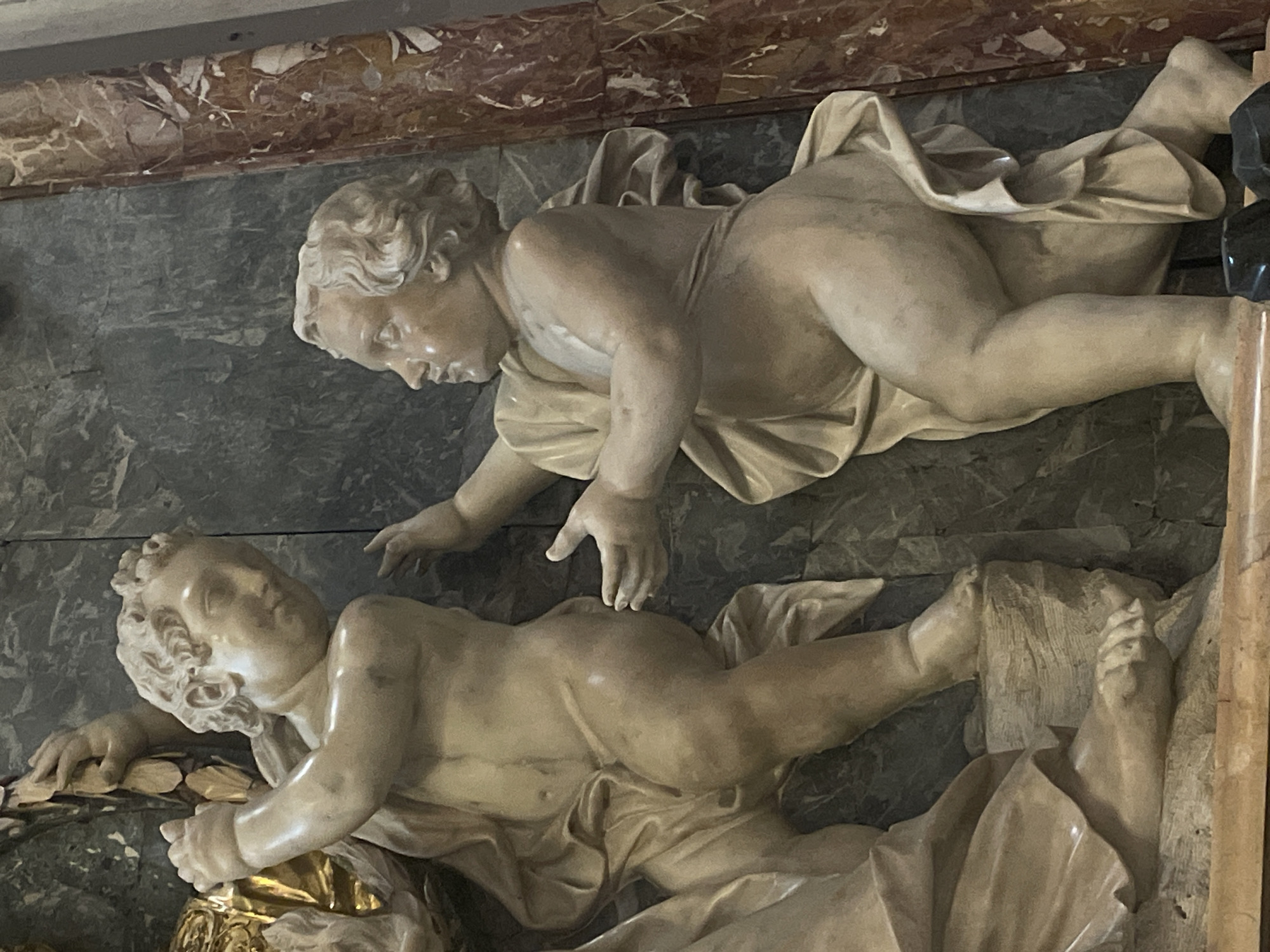 Two marble angel sculptures lie against a marble wall