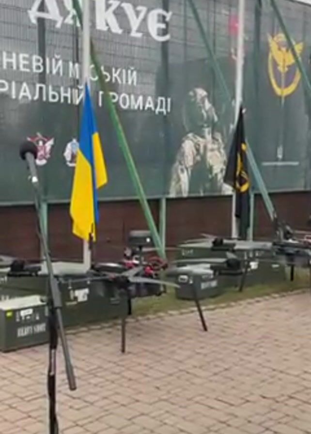 several drones on stands in front of a banner in what appears to be an outdoor event. The drones are mostly black and gray, and they are labeled with the text "HEAVY SHOT." In the background, there is a banner with the Ukrainian flag and what appears to be a black flag with a crest. A microphone on a stand is visible at the left. The foreground is paved with bricks. The banner behind the drones features the Ukrainian flag, a military-themed image of a soldier, and text in Ukrainian.