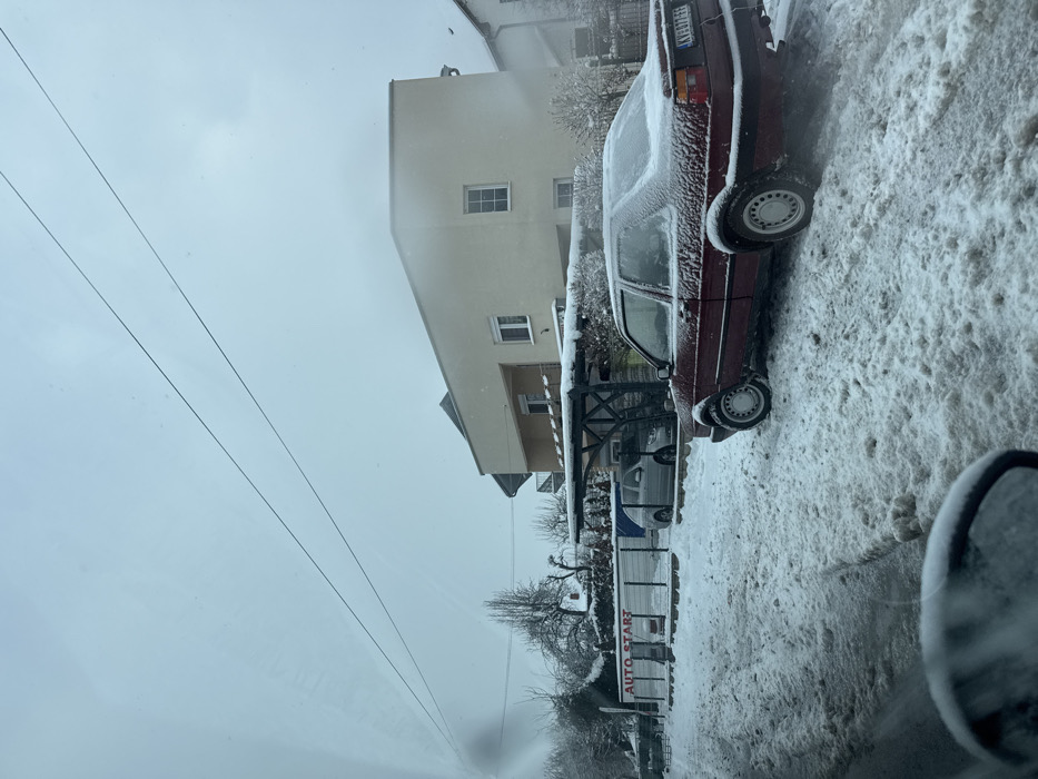 A snowy street scene features a maroon car parked on a snow-covered curb. A light-colored building stands behind the car. In the distance, a sign that reads "AUTO START" is visible among bare trees. Overhead, power lines run across the sky. The scene appears to be captured from inside a vehicle, indicated by the partial view of a side mirror in the corner.
