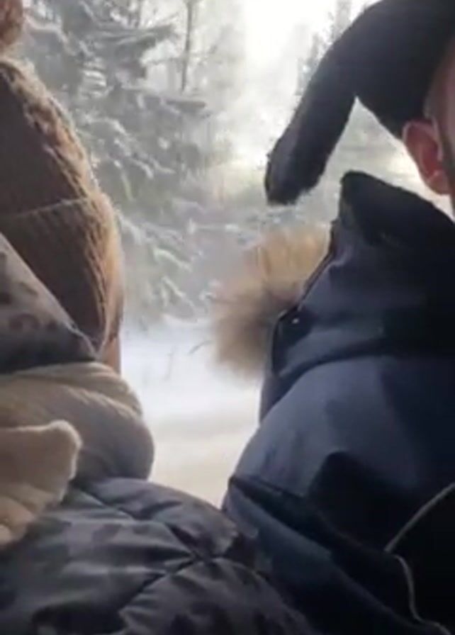 From inside a vehicle, two people are seen bundled up in winter clothing looking out the window