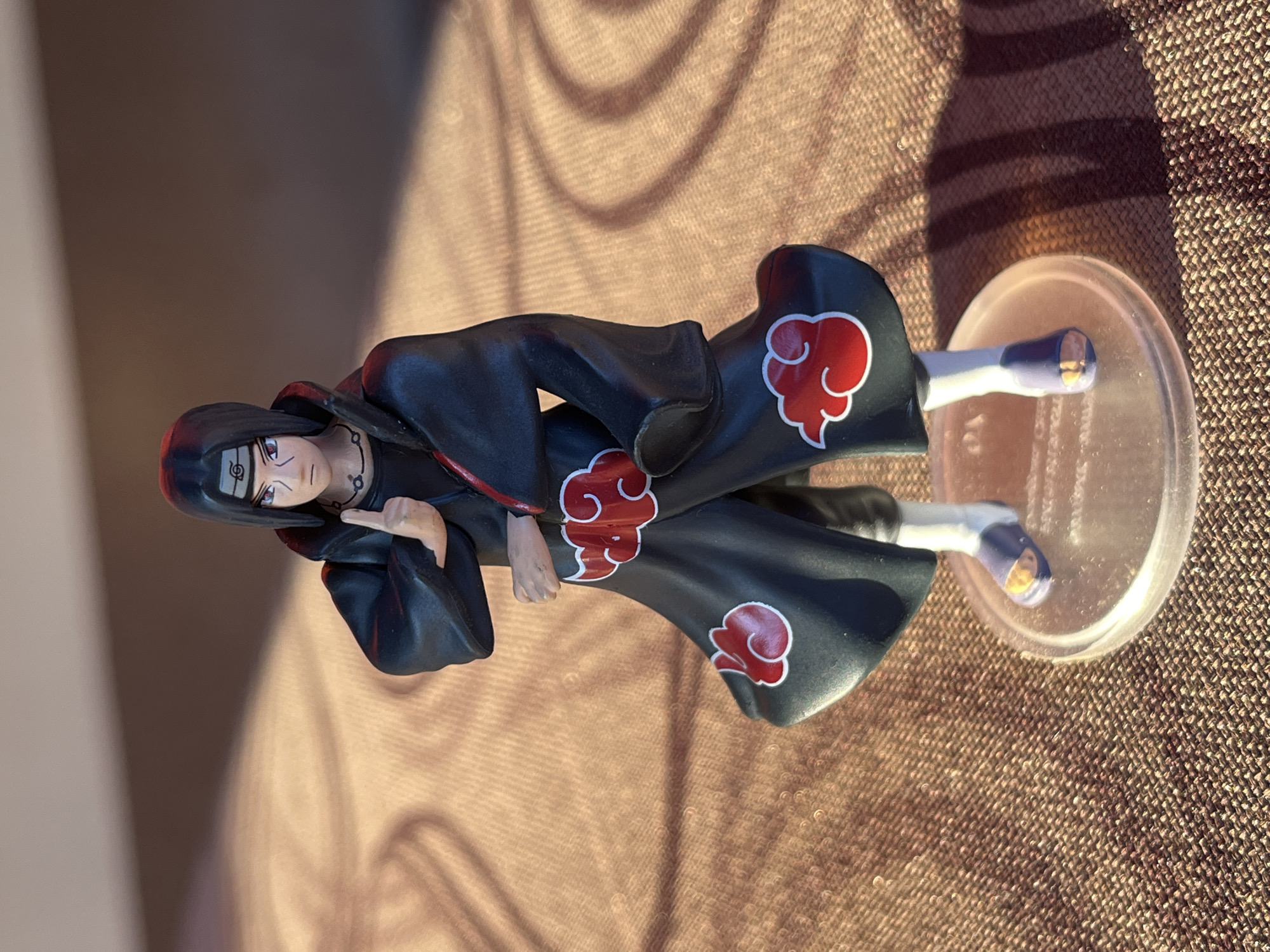 - "n Itachi Uchiha figure standing on a clear plastic base, placed on a textured brown surface" by FM-JCVbC2, licensed under CC BY 4.0