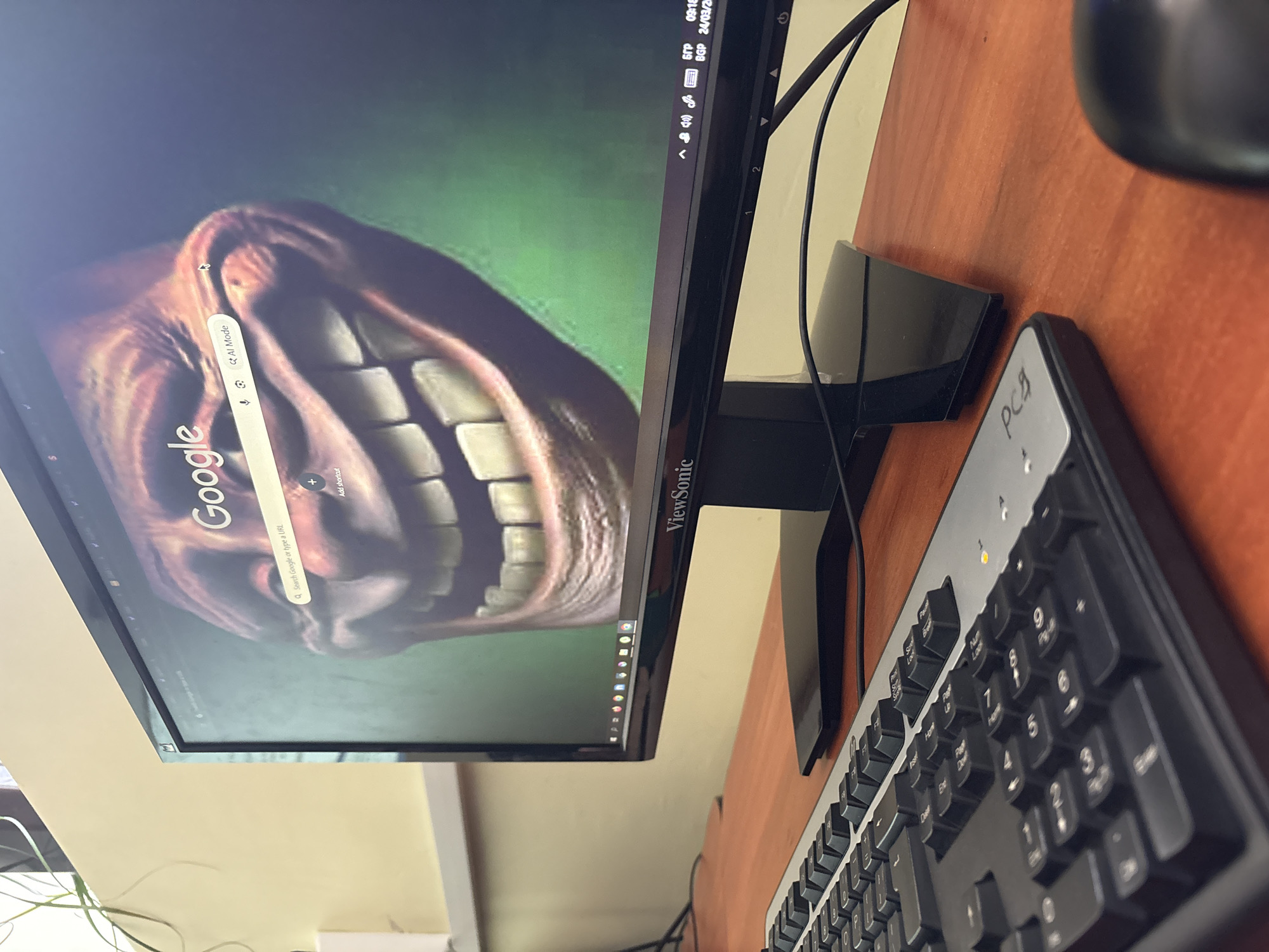 The scene depicts a desktop computer setup on a reddish-brown wooden desk, likely in an office or educational setting in Varna, Bulgaria. A black ViewSonic monitor is centered, displaying the Google Chrome web browser homepage. The background image on the monitor is a close-up of the "Trollface" meme, characterized by a wide, unsettling grin and large teeth. The Google search bar is visible, along with an "AI Mode" button. The Windows taskbar at the bottom of the monitor shows several application icons. The system tray in the lower right corner displays the time "09:19", the date "24/03/2023", and a language indicator "БГР" (Bulgarian). Network, volume, and what appears to be a battery icon are also present. In the foreground, a black and silver wired keyboard rests on the desk, with the alphanumeric keys and part of the numeric keypad visible. The characters "PC9" are handwritten in black marker on the silver section of the keyboard. A black wired computer mouse is partially visible on the right side of the desk, positioned next to the keyboard. Black cables are visible running from the monitor and peripherals across the desk. The background consists of a plain light beige wall, with a thin white horizontal ledge or shelf running along the bottom. A slender green plant stem is visible on the far left against the wall.