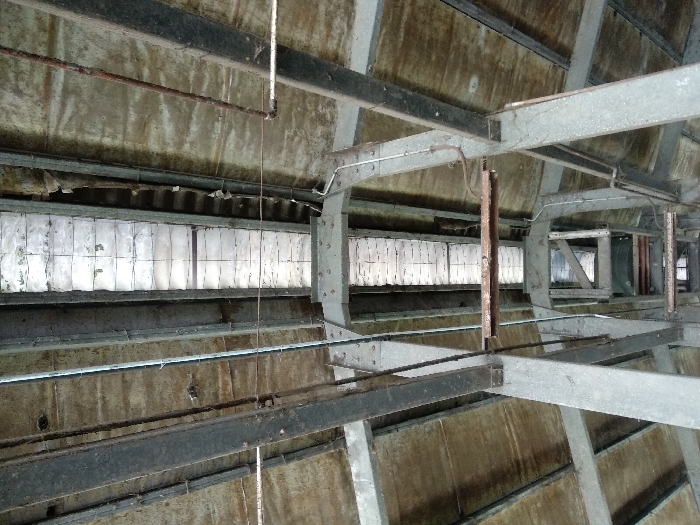 This image captures a forensic view of an overhead structural and utility space, observed from a low vantage point looking upwards, located in Bogor, Indonesia. The scene is devoid of human presence. The primary visual elements consist of a complex framework of dark gray, likely steel, beams forming a robust support structure that recedes vertically into the upper and lower portions of the frame. These beams are interconnected with visible bolts, suggesting a modular or assembled construction. They define the perimeter of a central, vertical shaft or large duct. The surfaces surrounding this metal framework appear to be composed of a dirty, mottled brownish-gray material, possibly aged concrete or fiberboard panels, showing staining and signs of wear. Running centrally and vertically through the entire image is a rectangular channel or large duct, the interior of which is lined with light-colored, segmented panels that appear to be insulated, exhibiting a textured or slightly corrugated surface. Minor damage or displacement is visible on some of these interior panels. Multiple dark-colored, thin conduits or pipes, some showing signs of rust, traverse the scene, running along the metal beams and occasionally crossing the central channel. Two distinct, dark, horizontal bars or small beams are also present, spanning across the central channel at different vertical levels. The overall environment presents as an aged industrial or utility area, characterized by its structural elements and infrastructure components. Illumination appears to be indirect, potentially emanating from within or above the central channel.