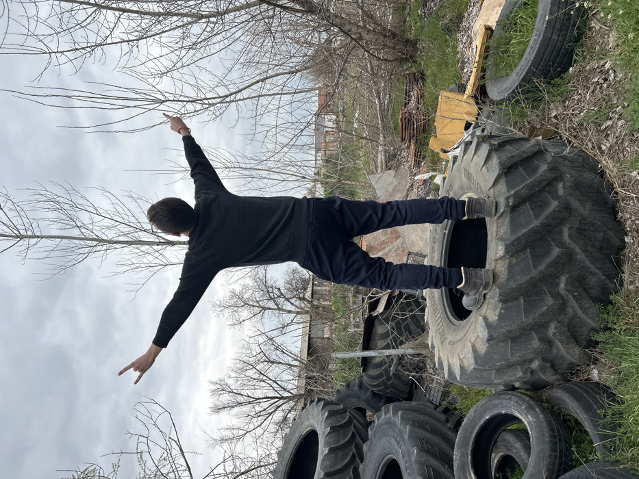An individual stands with their back to the viewer, positioned atop a large, heavily-treaded tire in Malo Konare, Bulgaria. The person is dressed in a dark long-sleeved top, dark sweatpants, and dark boots. Both arms are extended horizontally outwards and slightly upwards. The left hand displays a "rock on" gesture, while the right hand makes a similar gesture. The individual's head is tilted upwards, looking towards the overcast, grey sky. To the left of the standing figure, a pile of several large tires is visible. The immediate ground level consists of sparse green grass and dry vegetation. To the right, at ground level, smaller tires and miscellaneous debris, including what appears to be discarded wood and possibly insulation material, are scattered. In the background, numerous leafless deciduous trees with thin branches dominate the midground. Further in the distance, partially obscured by the trees, are low-rise, possibly derelict, structures.