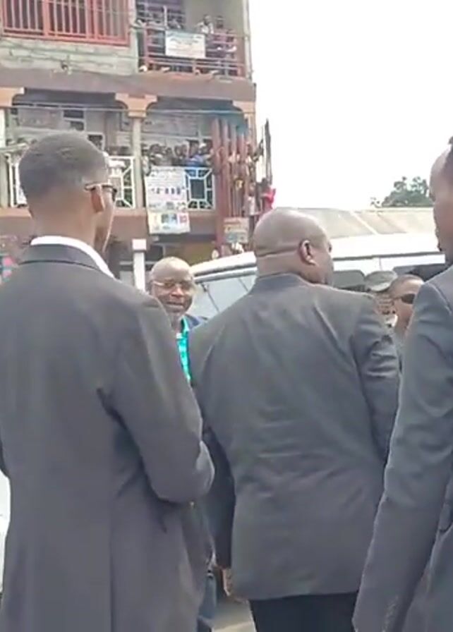 group of people in suits surrounded by a crowd in a city. The people in suits are walking towards a white SUV. The crowd is standing on the street and on balconies of nearby buildings. There is a woman in the group of people with braided hair and wearing sunglasses. There is also a man in military uniform carrying a rifle. Buildings with advertisements line the street.