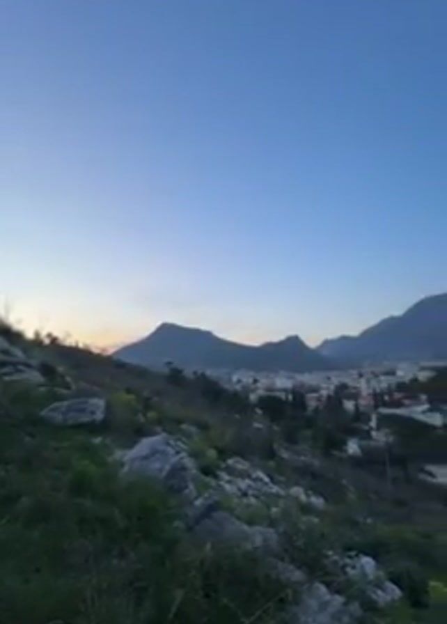 cityscape nestled between mountains. The foreground is a grassy, rocky hillside. The buildings in the city are mostly white with red tile roofs. The mountains in the background are a hazy gray, with hints of snow on their peaks. The sky is a clear blue, transitioning to orange near the horizon.