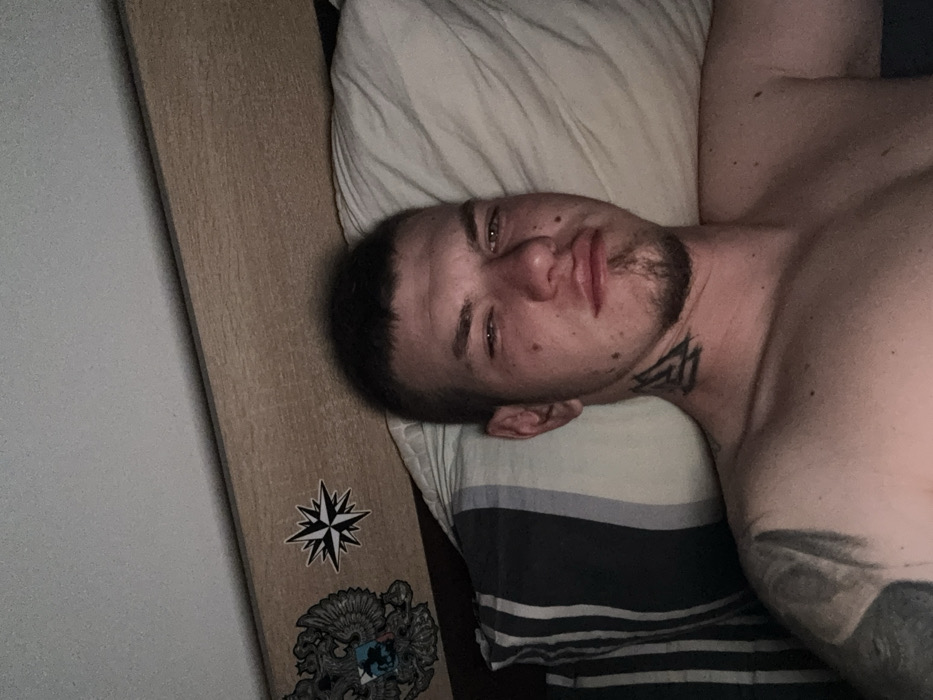The scene is located in the city of Maritsa, Bulgaria. A male individual is depicted from the upper chest upwards, positioned as if lying down with his head resting on a light-colored pillow. He has short, dark hair and a soul patch/goatee under his lower lip. Visible tattoos include a black geometric design on the right side of his neck and a large, dark, intricate pattern covering his left shoulder and upper arm. His eyes are partially closed, and his lips are slightly pursed. The individual is shirtless. To his left, a striped pillow or bedding material, featuring alternating dark and light bands, is visible. Behind him, a light-colored, possibly wooden, headboard or wall panel is present. Affixed to this surface are two stickers: a double-headed eagle emblem with a central shield on the left, and a black and white multi-pointed star or compass rose design on the right. The lighting is dim, with illumination focused on the subject's face, suggesting a light source from above or directly in front. The individual is looking towards the camera, and no other subjects or explicit interactions are visible.