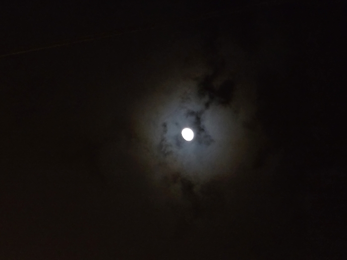 The image displays a nocturnal sky scene. A bright, circular celestial body, consistent with a full or near-full moon, is centrally positioned, radiating light through a surrounding halo of diffuse, dark grey cloud formations. The majority of the sky background is deep black. A thin, faint, linear object, appearing to be a wire or cable, extends diagonally downwards from the upper right edge of the frame. There are no discernible terrestrial landmarks, people, or objects within the image that indicate a specific location in the city of Tel-Aviv, Israel, or any other urban area. The scene is limited to the sky.