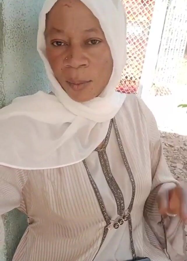 woman wearing a white headscarf and a tan dress. She is seated outdoors, leaning against a light blue wall. In the background, there is a wire fence, some trees, and what appears to be a gravelly surface beneath her. She waves her hand and then looks at her fingers, displaying a ring on her hand. She seems to be the only person visible in the frame.