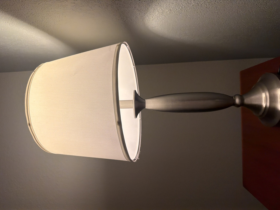 An indoor scene in Dover, United States of America, depicts a lit table lamp positioned on a dark reddish-brown wooden surface. The lamp consists of a brushed metal base and an elongated, tapering stem. A white fabric drum lampshade, internally illuminated, rests atop the stem. The lampshade's upper and lower rims are trimmed, exhibiting minor dark blemishes and slight fraying on a section of the lower rim. The lamp casts light onto a textured wall on the right and an adjoining smoother wall on the left. No individuals or specific actions are present within the frame.