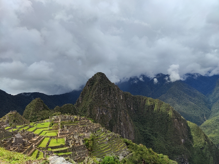 Machu Picchu ruins are nestled amongst verdant, terraced hillsides. Stone structures blend with the landscape, situated below a towering, jagged mountain peak. Lush, green mountain ranges stretch into the distance, partially obscured by low-hanging, grey clouds. The scene exudes a sense of historical grandeur and natural beauty.