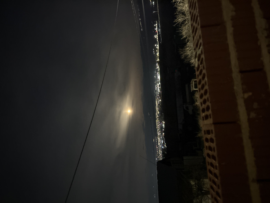 This nighttime image captures a panoramic view from an elevated position within the city of Pokrovnik, Bulgaria, looking out over a valley. The foreground is occupied by the top course of a red brick wall, presenting a perforated surface texture. Immediately behind the wall, dry, sparse vegetation is visible. In the midground, dark, indistinct structures resembling outbuildings or sheds are present, along with a light-colored utility vehicle, possibly a flatbed truck or van, partially obscured by shadow. The background features a sprawling urban landscape marked by numerous illuminated city lights, indicating a significant populated area. Above the distant city, a prominent, luminous full or near-full moon is centered in the upper mid-frame, partially veiled by translucent clouds that create a soft glow. The night sky is predominantly dark with varying cloud cover, and a single dark utility wire or cable traverses horizontally across the upper portion of the frame. Faint, linear light trails, possibly from aircraft or other distant moving lights, are discernable in the upper right quadrant of the sky. No individuals or specific actions are identifiable within the frame.