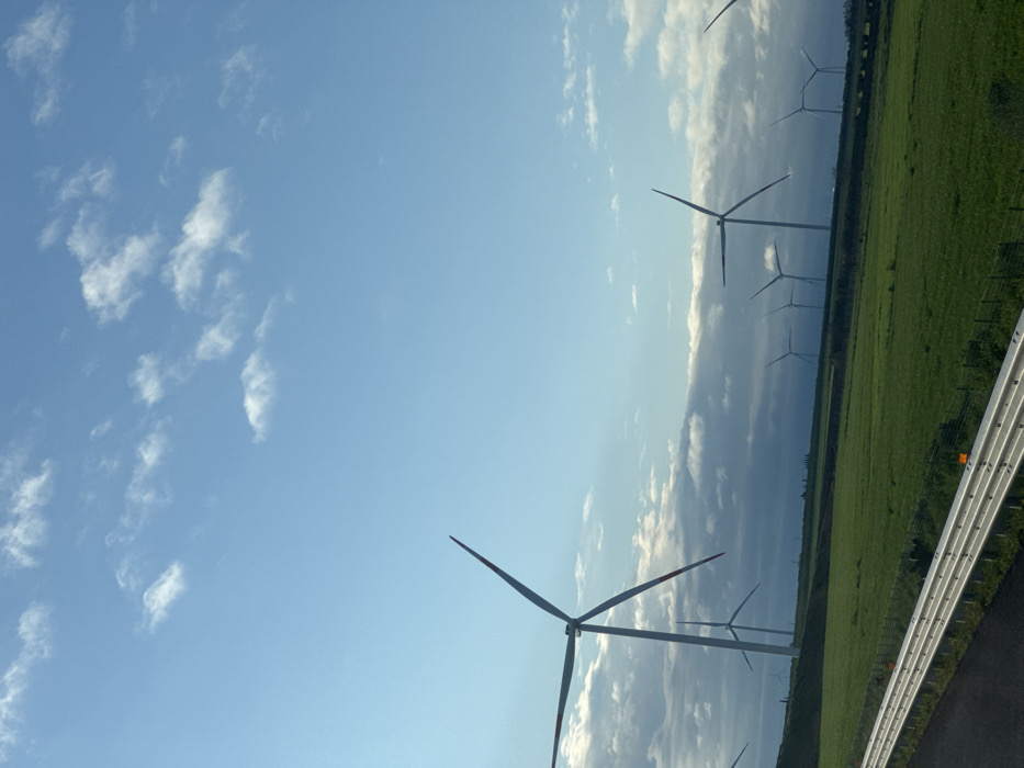 The image displays a rural landscape near Carapelle, Italy, under a blue sky with scattered white clouds. Multiple wind turbines are the primary subjects, distributed across the middle ground and background. One prominent, three-bladed wind turbine with red-tipped blades is positioned in the mid-left foreground. Additional three-bladed turbines are visible further back, becoming progressively smaller and less distinct towards the horizon, where a band of darker, extensive clouds partially obscures their bases. The foreground consists of vibrant green fields. In the immediate lower-left, a multi-segmented, reflective metal guardrail with orange markers runs diagonally, separating a dark surface, likely a road or shoulder, from the green field. No individuals, animals, or active movements are depicted.