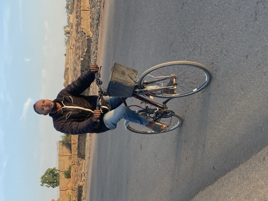 A man rides a bicycle with a basket on a paved road. He wears a dark jacket, jeans, and sandals. The scenery includes a blue sky, buildings with stone walls, and sparse vegetation. The road takes up a significant portion of the frame, showcasing the texture of the asphalt. The man appears to be enjoying a leisurely bike ride on a clear day.
