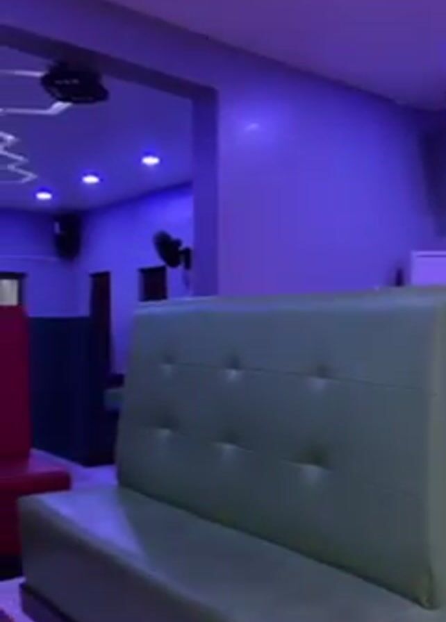 n interior shot of a karaoke establishment. The room has low lighting with blue and white LED accents on the ceiling. There are booths with padded benches in shades of green and red. There is a fan on the wall and a mini-fridge in the corner. In the background, there is another karaoke room.