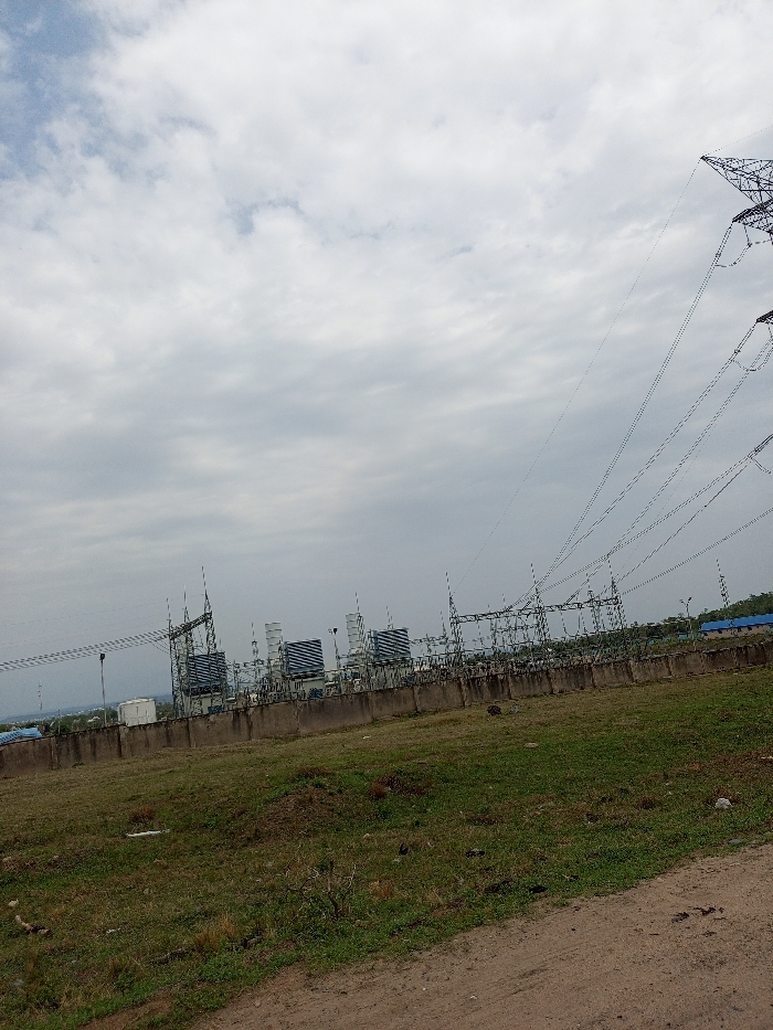 power substation in Ohunene, Nigeria, located at latitude 7.475, longitude 6.659. The substation is a large complex of metal structures and transformers, surrounded by a concrete wall. The substation is located in an open field, with a dirt road in the foreground. There are numerous power lines running across the sky. The sky is overcast with white clouds. There are no people visible in the image. The scene is a wide shot, taken from a distance. The image was taken in the daytime.