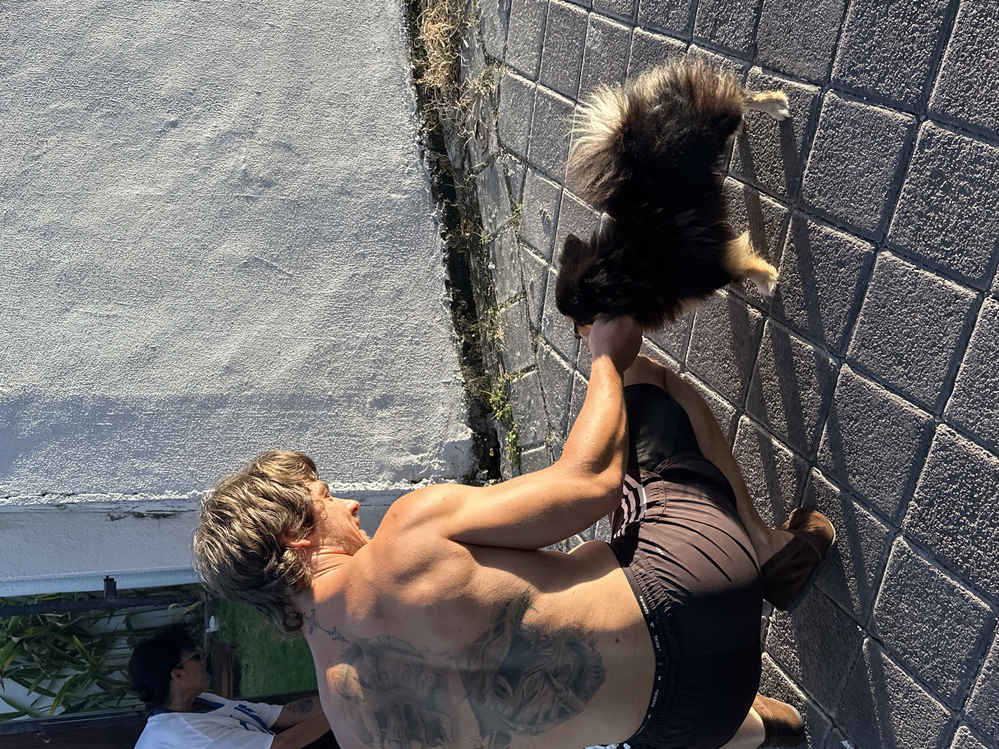 A shirtless, light-skinned man with shoulder-length wavy hair, wearing dark shorts and brown slippers, stands on a grey brick-paved surface in Dalung, Indonesia. He is holding a small, black and brown fluffy dog in his hands. The man has a large, dark tattoo covering most of his back. A white wall is visible in the background. Another person is partially visible seated in the background. Vegetation is seen near the wall and between the paved blocks. The lighting is bright, with strong shadows.