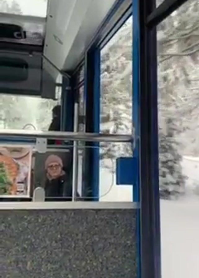 interior of a bus, likely moving, with a snowy landscape visible through the windows