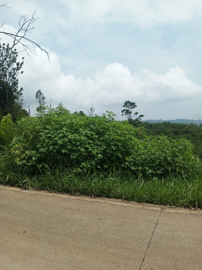 A concrete road with parallel grooved lines occupies the lower third of the frame, transitioning from a darker shade on the left to lighter on the right due to sun exposure. It borders a narrow strip of vibrant green grass and weeds. Beyond this, a dense, extensive mass of lush green foliage, consistent with tropical bushes or tall plants, dominates the midground, obscuring the ground beneath. Scattered taller trees, including one with notable bare branches on the far left and another with a full canopy towards the right, rise above this dense vegetation. In the background, gently rolling hills covered in uniform green vegetation extend under a partly cloudy sky, featuring large white cumulus clouds. No individuals, animals, or man-made objects other than the road are present. The scene is located in Vieng Phouka, Laos.