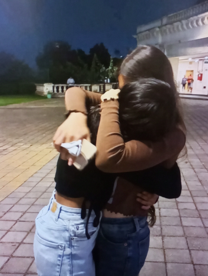 - "Two individuals are depicted embracing outdoors on a tiled pavement at dusk or nighttime in Aktash, Uzbekistan, within the grounds of what appears to be the Aktash Sanatorium" by FM-1o2DD3, licensed under CC BY 4.0