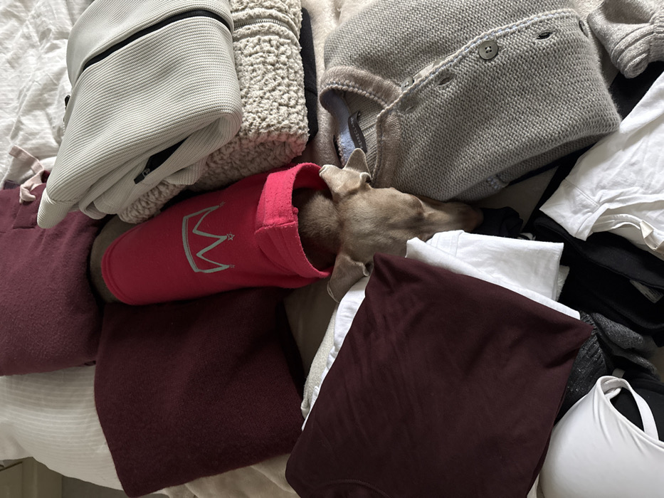 - "The scene depicts a light-colored dog, possibly a Weimaraner, partially obscured within a pile of clothing on what appears to be a bed in Raanana, Israel" by FM-XYDIJ2, licensed under CC BY 4.0