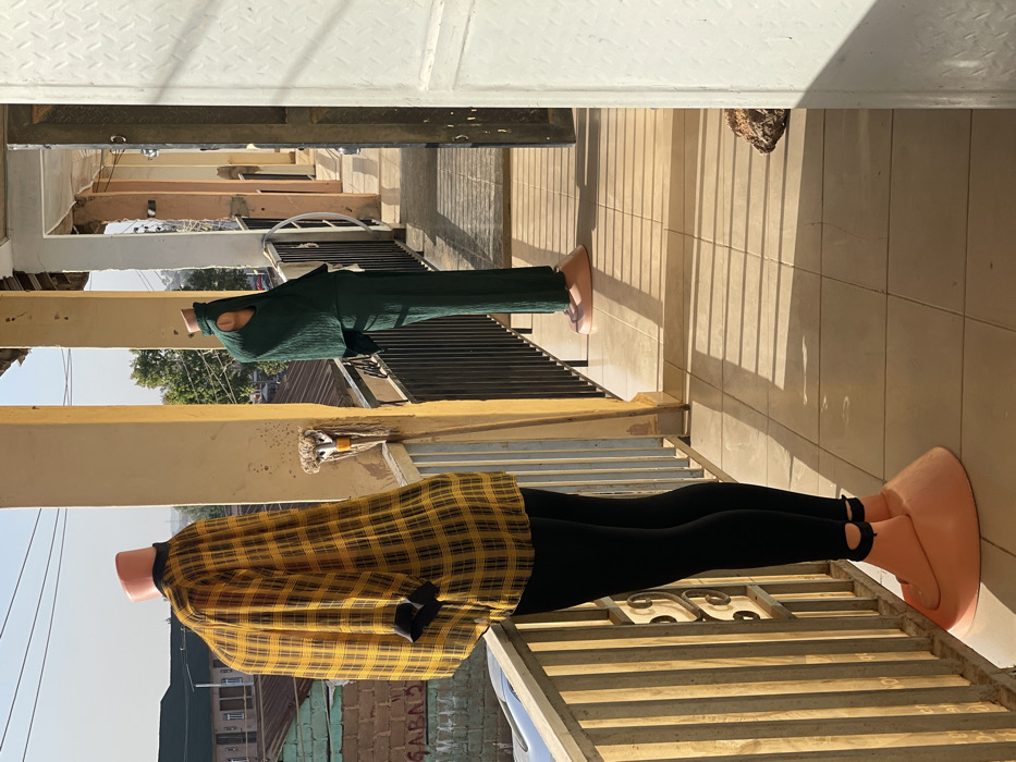 Two mannequins stand on a balcony. The first mannequin wears a yellow plaid shirt and black leggings, with large orange shoes. The second mannequin is dressed in green clothing with a hood and bare feet. The balcony has a tiled floor and metal railings. Outside the balcony, buildings, trees, and the sky are visible.