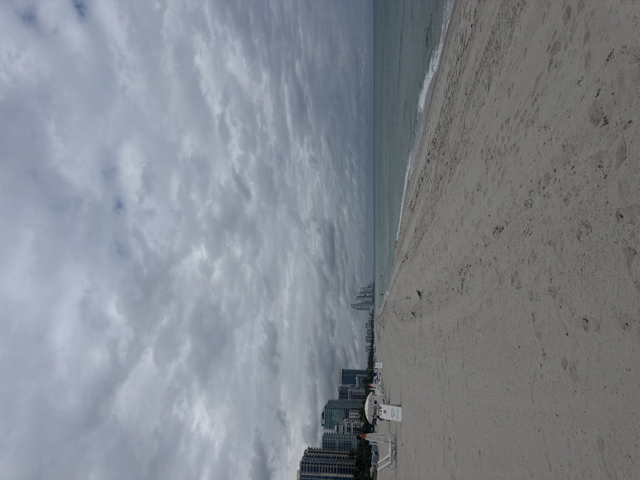 The image presents a beach scene under a cloudy sky. The sand occupies a significant portion of the frame, leading towards the ocean. Gentle waves are visible where the water meets the shore. In the distance, a cityscape with modern buildings rises along the coastline. The overall tone of the image is muted due to the overcast weather, creating a somber yet peaceful ambiance. A lifeguard stand sits near the edge of the beach.