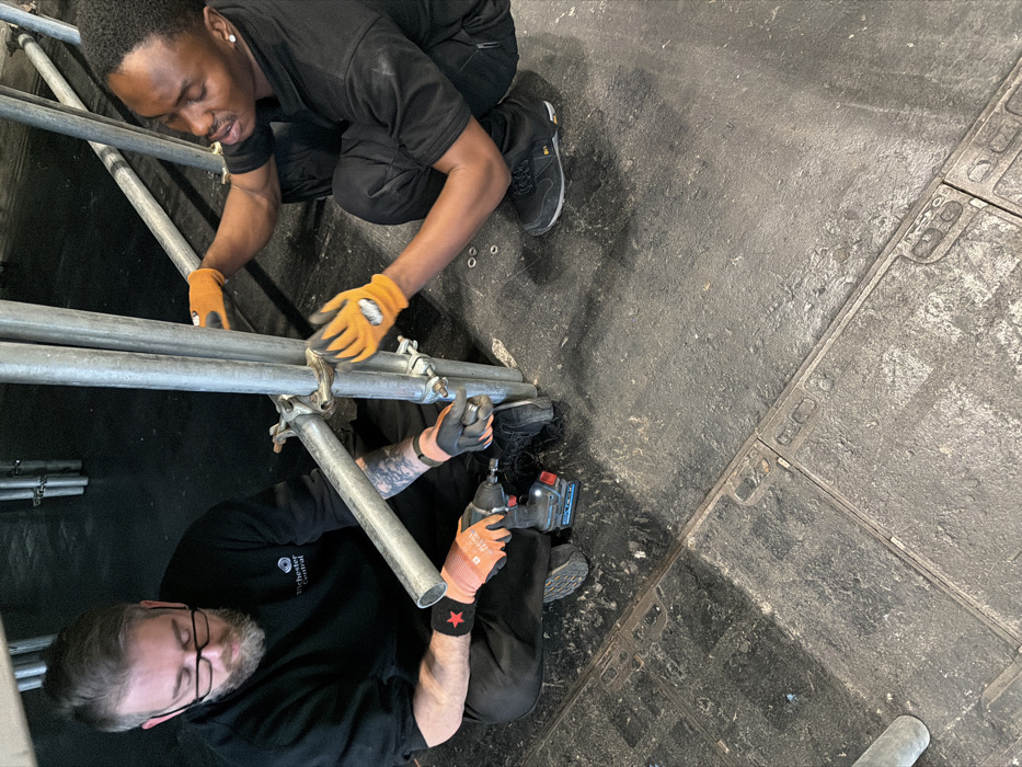 Two male technicians are actively engaged in the assembly of a modular metallic truss or scaffolding system at the Manchester Central Convention Complex in Manchester, United Kingdom
