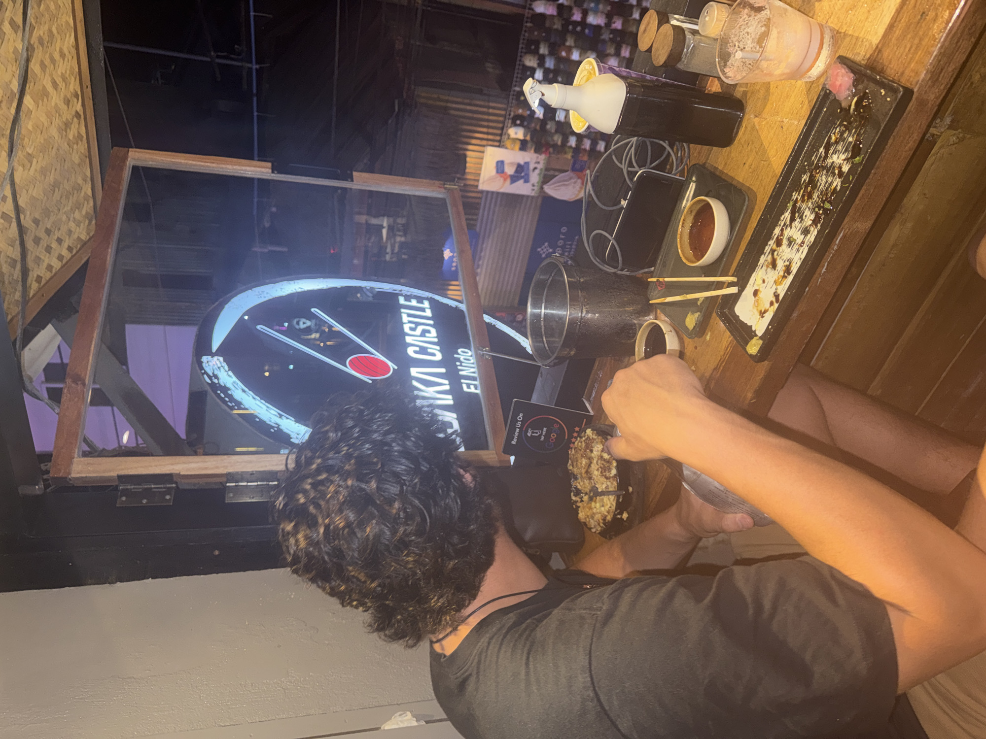 A medium shot captures a seated individual with curly brown hair, wearing a black t-shirt, facing a television displaying the logo "RIKA CASTLE El Nido." The person appears to be dining, with a partially consumed dish in front of them and a utensil in their hand. On the right side of the image, a wooden table holds various items, including a small bowl with a dark liquid, an empty sushi tray, a cell phone, and containers of various sizes. The environment suggests an outdoor dining area, likely in El Nido, Philippines, given the location mentioned in the television logo. The lighting is subdued, indicating either evening or low indoor light levels.