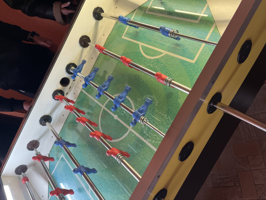 The image captures an elevated, downward-angled view of a foosball table situated indoors in Rudozem, Bulgaria