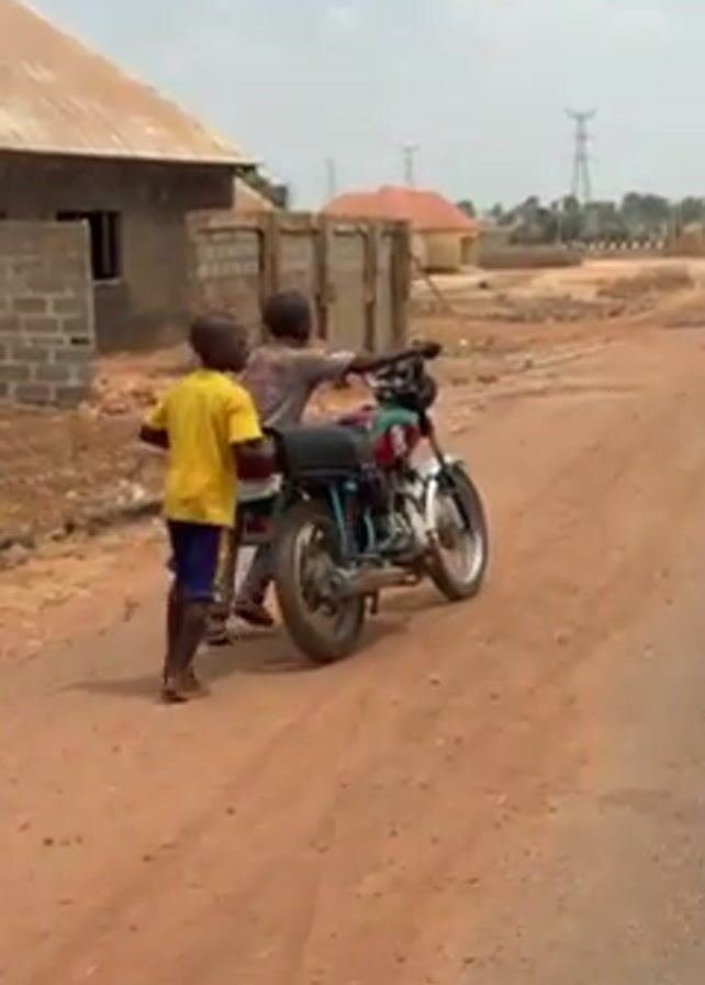 Two children are pushing a motorcycle down a dirt road. The child in the back is wearing a yellow shirt and blue shorts. The child in front is sitting on the motorcycle. The motorcycle has a custom paint job. There are several houses in the background, some of which appear to be under construction. The road is dusty and red. The sky is overcast.