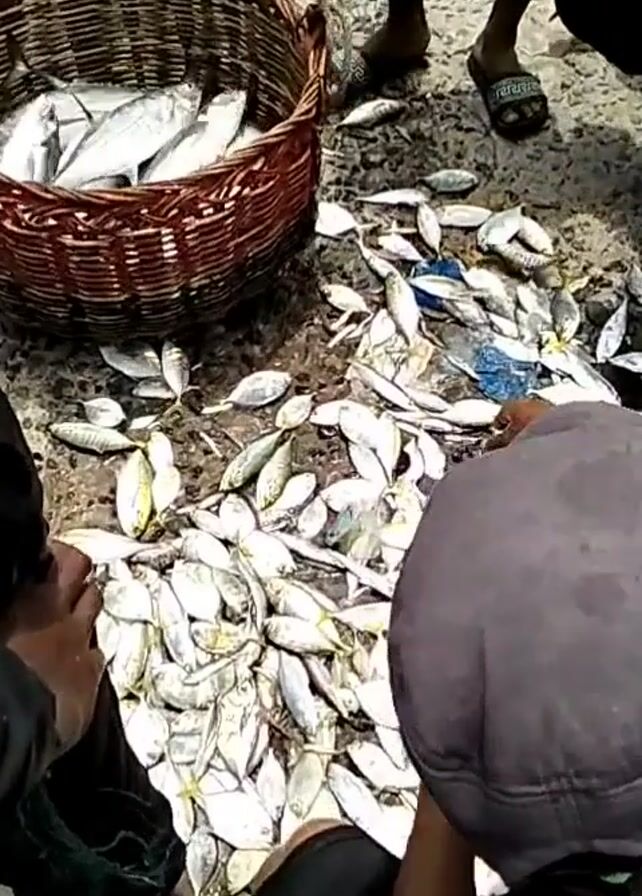 group of people standing around a large pile of fish on the ground. A woven basket, partially filled with more fish, sits next to the pile. The fish are mostly silver in color, and some are small. People are visible, some wearing sandals or sneakers, and one in a grey hooded shirt. The ground appears to be concrete or stone. The overall setting appears to be outdoors, possibly near a dock or market.
