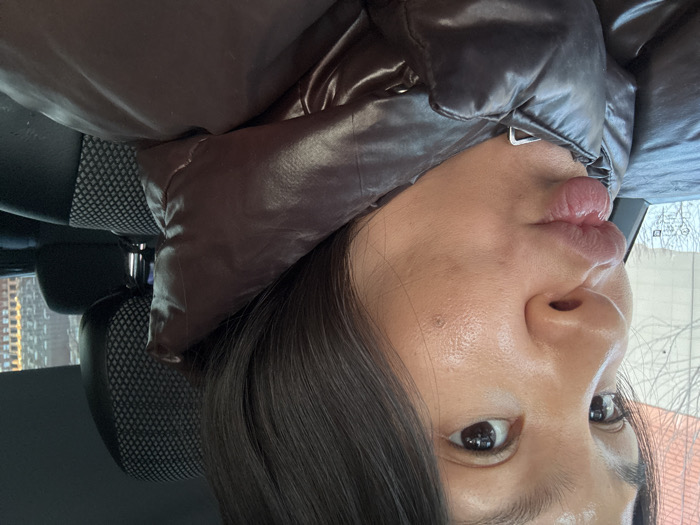 A close-up portrait features an individual, likely female, with dark hair, dark eyes, and a medium complexion, occupying the interior of a vehicle