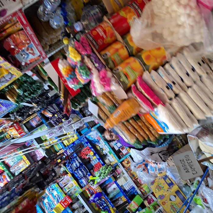 A vibrant and cluttered market stall displays a diverse array of goods. Drinks, sweets, and candies are prominently featured, alongside packaged rice and other grocery items. The assortment is dense and colorful, typical of a local market or small shop. Products are stacked high and arranged haphazardly, creating a visually stimulating scene.