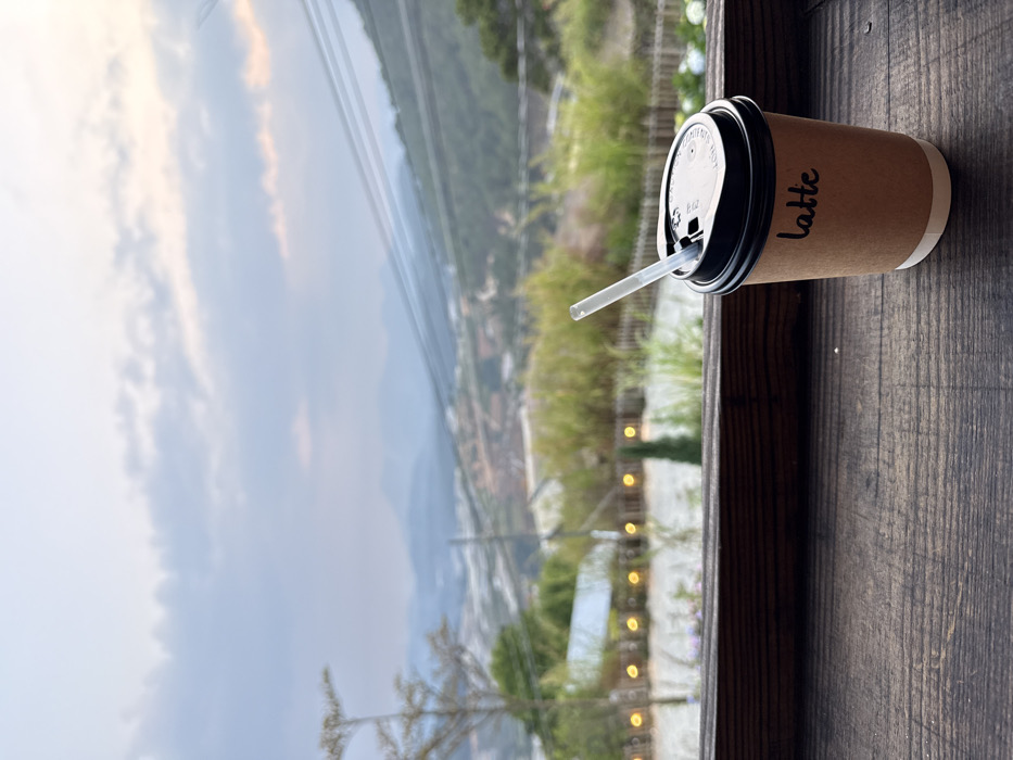 The image displays a brown paper latte cup with a black plastic lid and a clear straw, positioned on a dark, weathered wooden surface in the foreground. The word "latte" is handwritten in black script on the cup. The scene is set in Xuân Thành, Vietnam, offering an elevated perspective of a valley. The background features rolling hills and distant mountains partially obscured by atmospheric haze under a cloudy twilight sky with hints of orange and blue. In the midground, a fence-like structure is visible, along with greenery, scattered light sources, and several structures resembling greenhouses or buildings with reflective roofs. Multiple parallel utility lines traverse the upper right quadrant of the distant landscape. No individuals are present.
