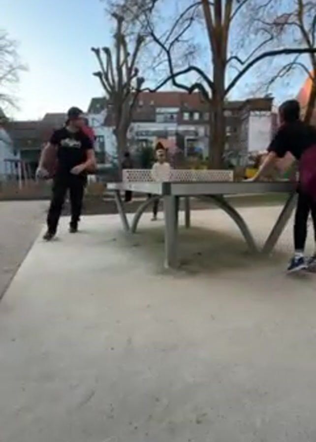 In a wide shot, an outdoor ping pong match is in progress in what appears to be a park