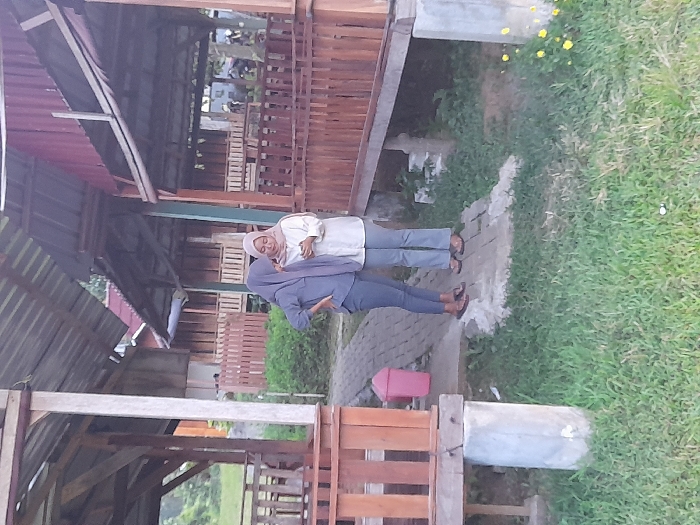 The image depicts two adult females standing on a paved walkway in what appears to be a recreational or semi-rural area in the city of Penanggungan, Indonesia, surrounded by multiple simple wooden structures