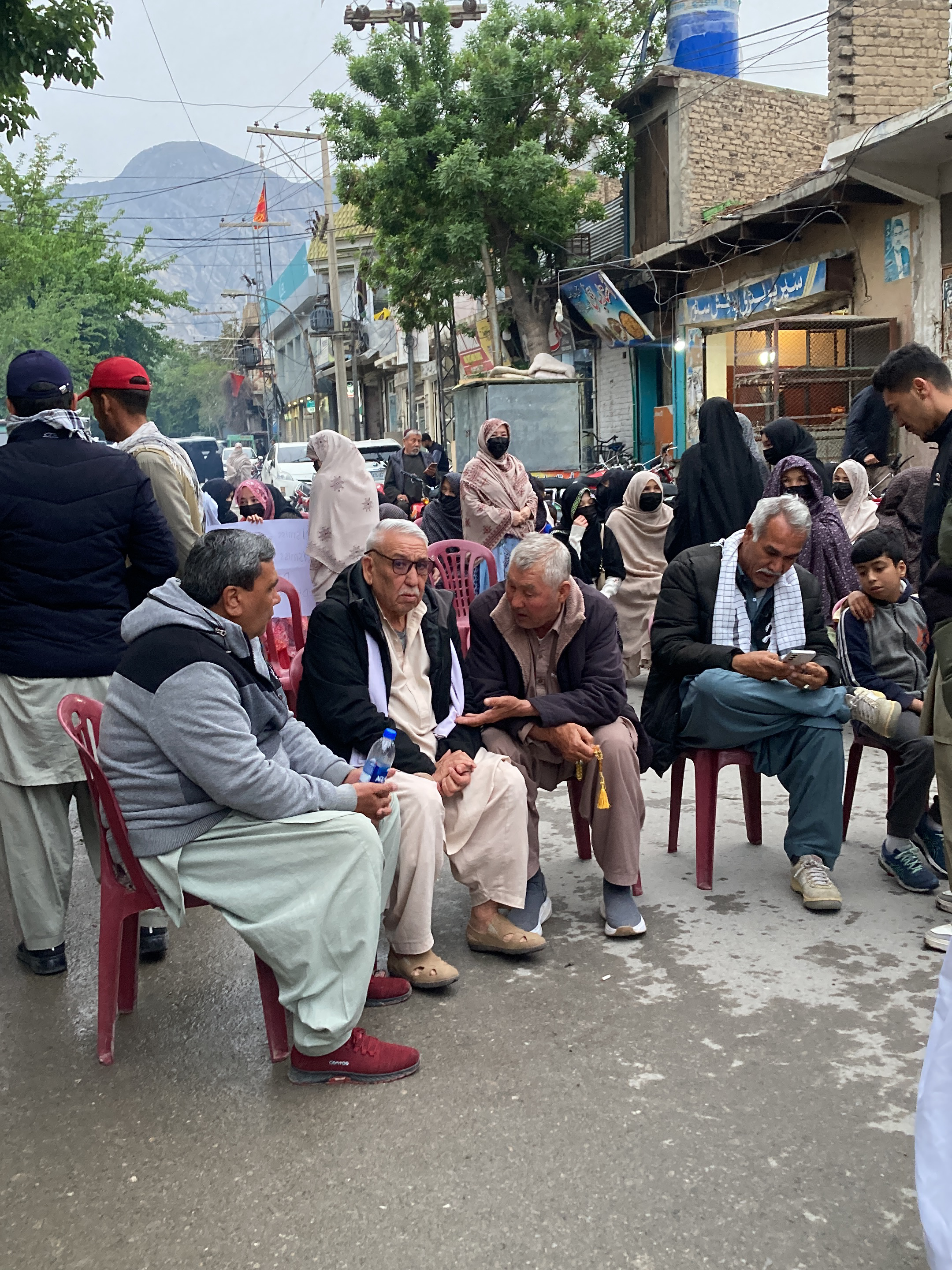 The image depicts a street scene in Quetta, Pakistan. Several men are seated on red plastic chairs, engaged in conversation. One man is using a mobile phone. A boy sits beside him. In the background, a group of women clad in hijabs and niqabs are standing or sitting. Some wear face masks. Behind the seated men, there are people walking and vehicles in the street. The street is lined with buildings, including a storefront with signage in Urdu. Overhead power lines are visible. In the distance, a mountain is visible, with a flag atop a pole. The ground appears wet.