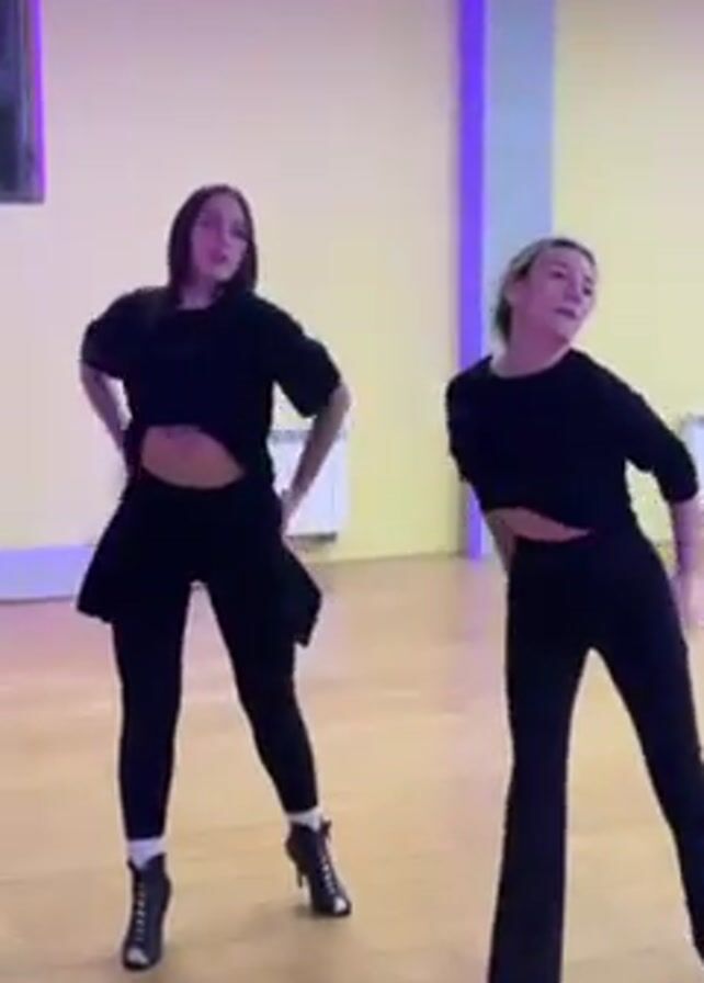Three women are dancing in a dance studio. The women are wearing black clothes. The women are in a room with yellow walls. The room has two radiators and a window. The woman in the front is wearing high-heeled shoes. The music is loud.