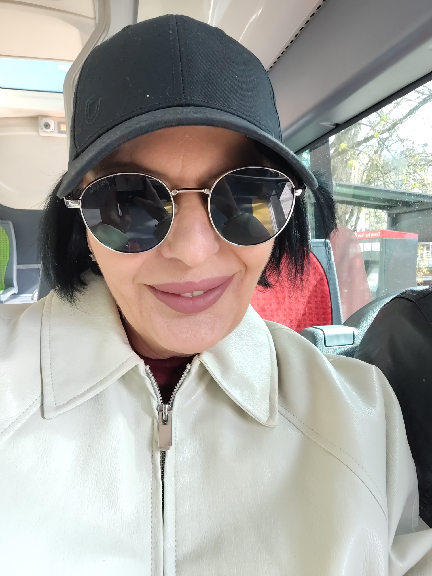 A woman is depicted from the chest up, positioned inside a public transport vehicle in Strasbourg, France. She has dark hair, wears a black baseball cap with a dark, stylized logo, and round, silver-framed sunglasses. Her lips are painted a light pink, and she exhibits a slight smile. She is dressed in an unzipped, light cream-colored jacket with a prominent silver zipper pull, revealing a burgundy garment underneath. The interior environment behind her includes red patterned fabric seats and a grey plastic armrest/partition, with a partially visible green textured seat to her left. Above, a white ceiling panel features an overhead light fixture and a small, white security camera. Through the vehicle's windows, verdant trees are visible, and on the right exterior, a red and silver public transport structure, potentially a ticket vending machine or information kiosk, is present.