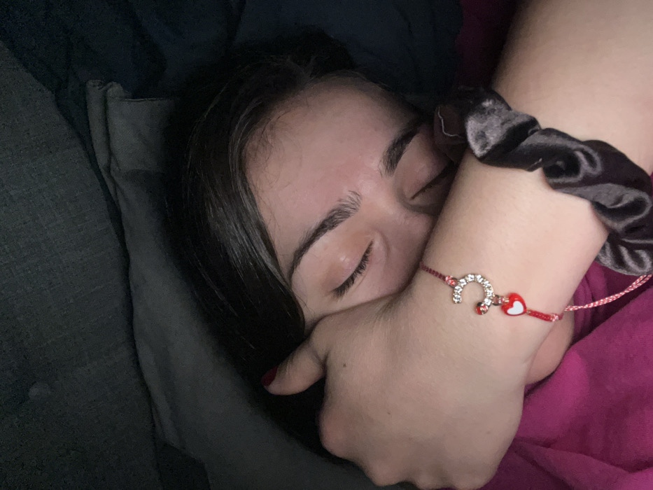 The image depicts a close-up of an individual, likely female, lying indoors with closed eyes, suggesting sleep or rest. Dark hair is visible framing the forehead and extending across the head. The person's right hand, adorned with red nail polish, partially obscures the lower portion of the face. On the person's left wrist, a red string bracelet is visible, featuring a silver-colored 'C' charm encrusted with clear rhinestones, and two small red heart-shaped beads. Also on the left wrist is a dark, possibly black, satin-textured scrunchie. The individual wears a fuchsia-colored garment, visible on the lower left side of the frame. The background consists of dark, textured fabric, consistent with bedding or upholstered furniture, in a dimly lit indoor environment. This scene is located in Sofia, Bulgaria.