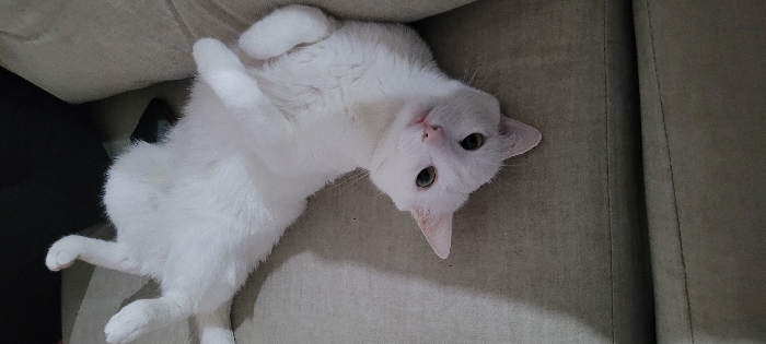 - "A white cat lies on its back on a beige couch" by FM-lpZ3r2, licensed under CC BY 4.0