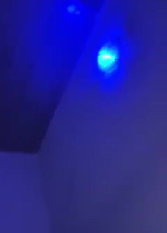 n indoor scene, lit primarily by a blue light emanating from a small, circular light fixture on a wall. The walls appear to be painted white or a light color, but the blue lighting casts a purple hue over them. A portion of the ceiling is visible, revealing a drop ceiling with rectangular tiles. The video then shifts its focus to a dark brown or black rectangular panel set into the wall near the ceiling, suggesting a small access door or panel. A silver latch or handle is visible on the panel. The camera moves slightly, showing more of the wall and ceiling, before returning to focus on the blue light.