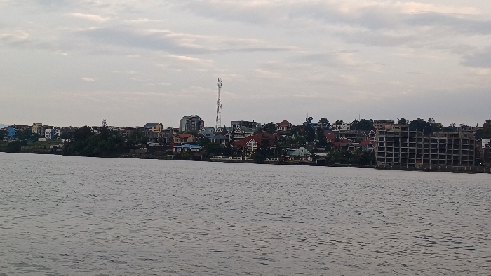 This image presents a panoramic view of the Goma city shoreline in the Democratic Republic of the Congo, observed from across Lake Kivu
