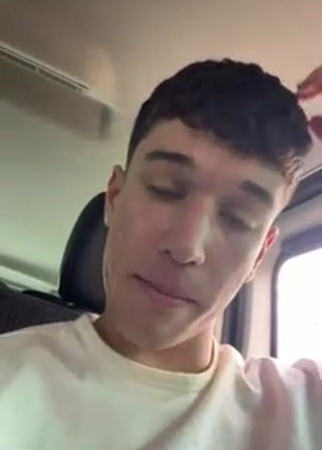 A young man with short dark hair and a white t-shirt is in a car. He looks directly at the camera, runs his hand through his hair, and sticks out his tongue briefly. The car interior and a glimpse of the outside are visible. Music is playing in the background.