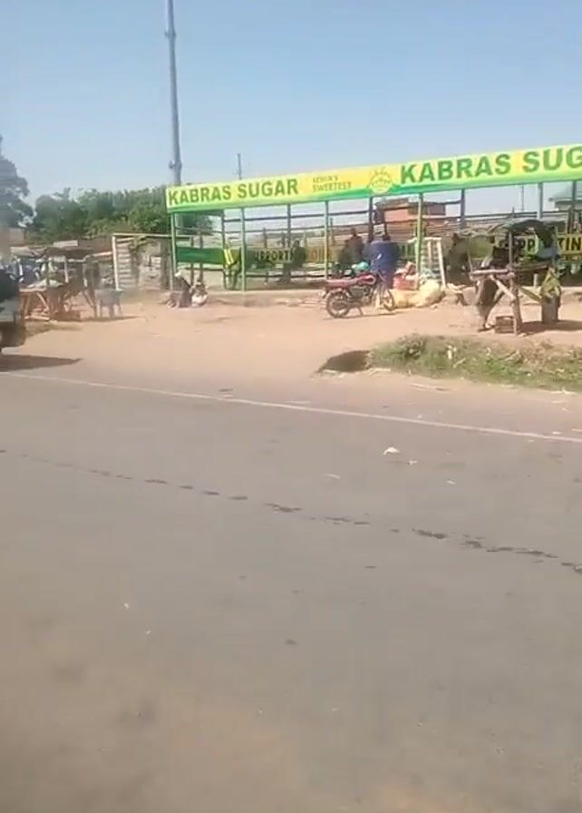 roadside scene in what appears to be a rural area. The road is paved and a few vehicles, including a minibus and several motorcycles, are seen. A structure advertising "Kabras Sugar" is visible on the side of the road. People are walking and standing in the vicinity, near shops and businesses, which include "Al Bahrain." The weather appears sunny and the sky is clear.