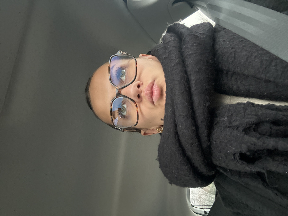 A woman with a shaved head and tortoise-shell glasses peers at the camera. She is wearing a black, heavily textured jacket or shawl that is pulled up high around her neck. Her skin tone is fair and her lips are full. A gold earring is visible in her left ear. The background is muted, suggesting she's in a vehicle.
